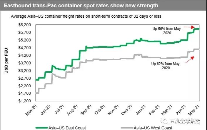 航运公司很少能达到完整的GRI,但如果需求超过供应,就像目前东行跨太平洋航线的情况,即使每FEU价格上涨100至200美元,也表明6月份的预订量相当强劲,将继续加剧亚洲装货港的舱位短缺。