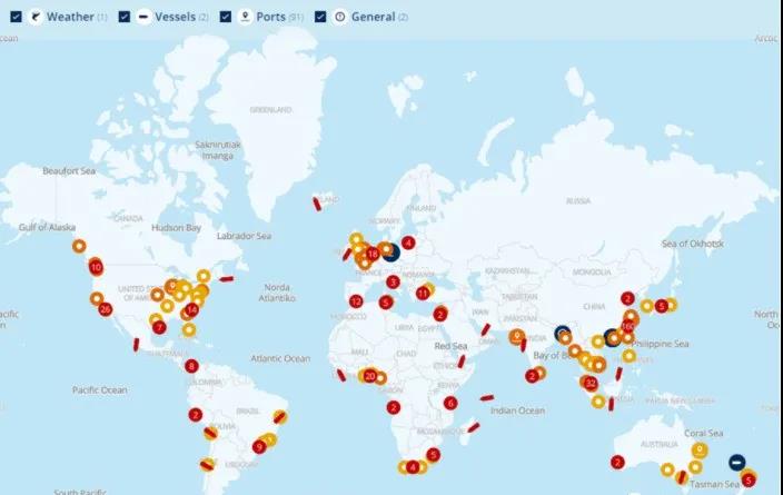 (红点代表船舶群,橙色代表拥堵或运营中断的港口)