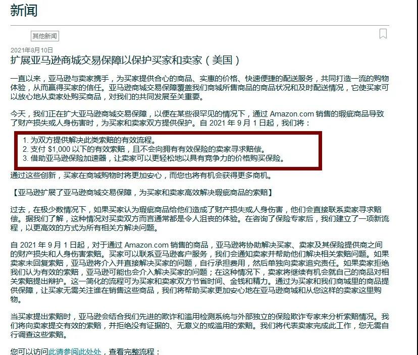 马逊发布新闻通知,将从保险方面扩大A-to-z保障,并更新卖家保险要求、推出保险加速器。根据保险新规,在美国站单月销售额达到1万美元就需要购买产品责任保险。部分卖家已同步收到邮件,新规将于9月1日生效。