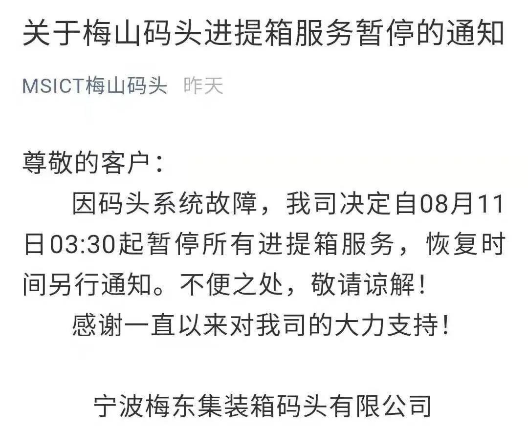此外,梅山码头发布了关于暂停所有进提箱服务的通知。通知表示:因系统故障,决定自8月11日3:30起暂停所有进提箱服务,恢复时间另行通知。
